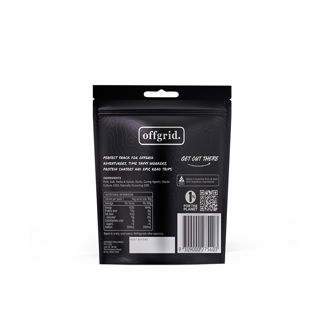Bite sized wood smoked salami in a handy re-sealable pack. Made local from 100% Australian free range pork. Firesticks are the perfect snack for offgrid adventurers, multi-day hikes, time savvy workers, protein chasers and epic road trips.